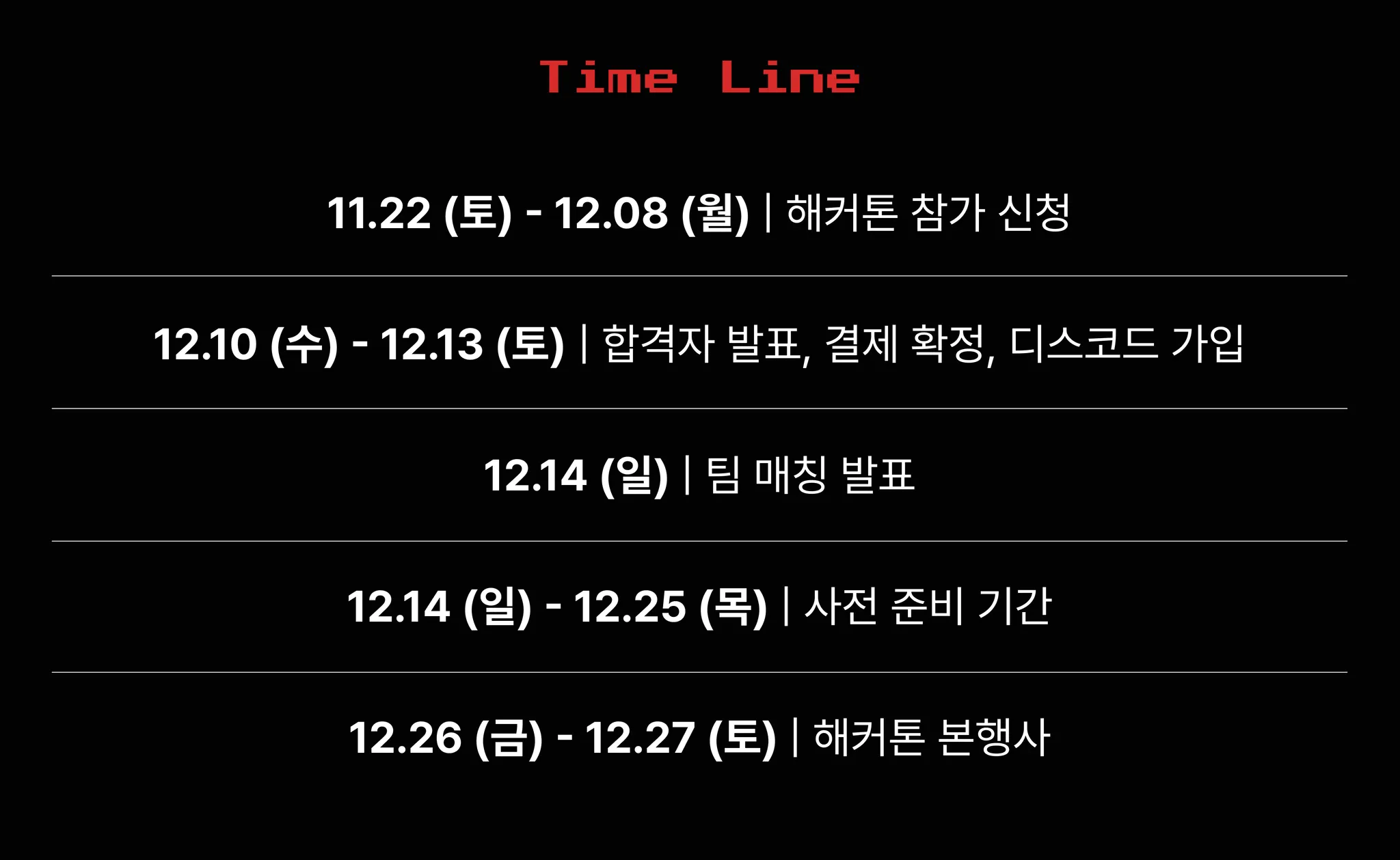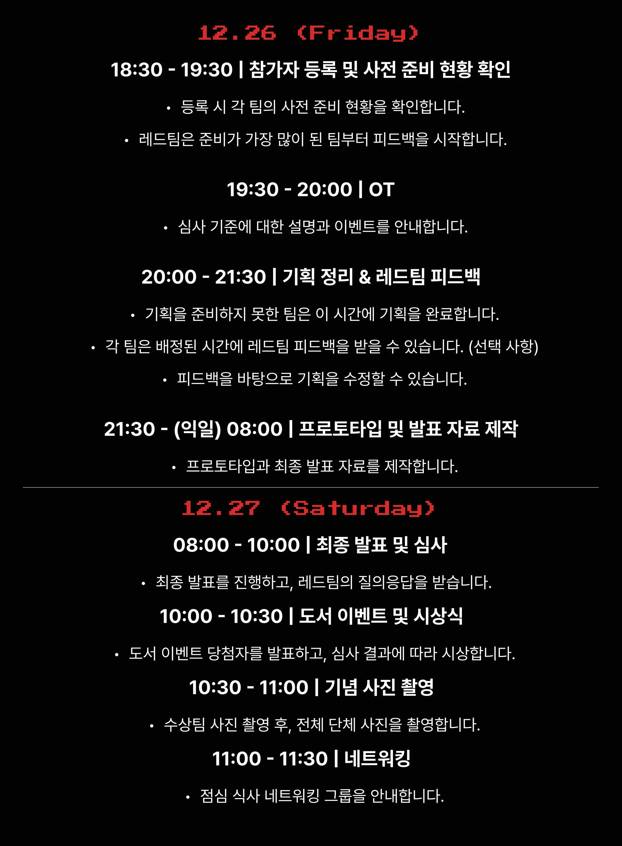 팀 매칭 후 12.14 - 12.25, 해커톤 당일을 효율적으로 쓰기 위한 준비 기간입니다.