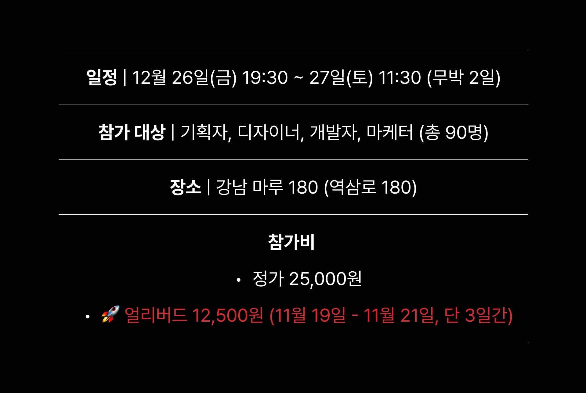 역할의 경계를 넘어 유저에게 도달하는 프로덕트를 완성해온 메이커들의 커뮤니티입니다. 직군 간 협업 노하우와 실행 경험을 공유하며 해커톤의 퀄리티를 더합니다.